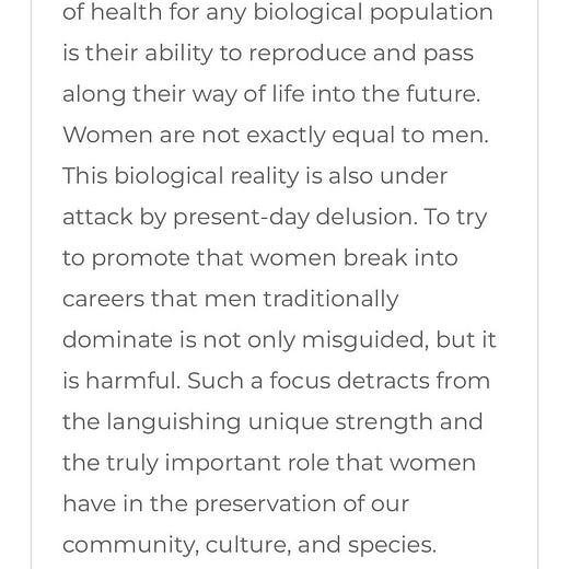 While it is sadly popular nowadays to think that the world would be better off without humans, or that Albertan children are unnecessary as we can import foreigners to replace ourselves, this is a sickly mentality that amounts to a drive for cultural suicide. The first rule of health for any biological population is their ability to reproduce and pass along their way of life into the future. Women are not exactly equal to men. This biological reality is also under attack by present-day delusion. To try to promote that women break into careers that men traditionally dominate is not only misguided, but it is harmful. Such a focus detracts from the languishing unique strength and the truly important role that women have in the preservation of our community, culture, and species…