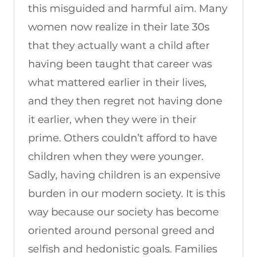 As a future parliamentarian, I would promote healthy appreciation for the value that young Albertan women have in their ability to carry our population forward into the future. I believe that the best approach would be to reward families for their reproductive service both with financial rewards to offset the financial burden they are taking on and with medals to symbolize their valuable achievement of having 2+ children. Encouraging our society to reorient in this healthier perspective would provide the greatest good for Alberta going forward and would alleviate many of the problems that we are currently facing. [Emphases mine]